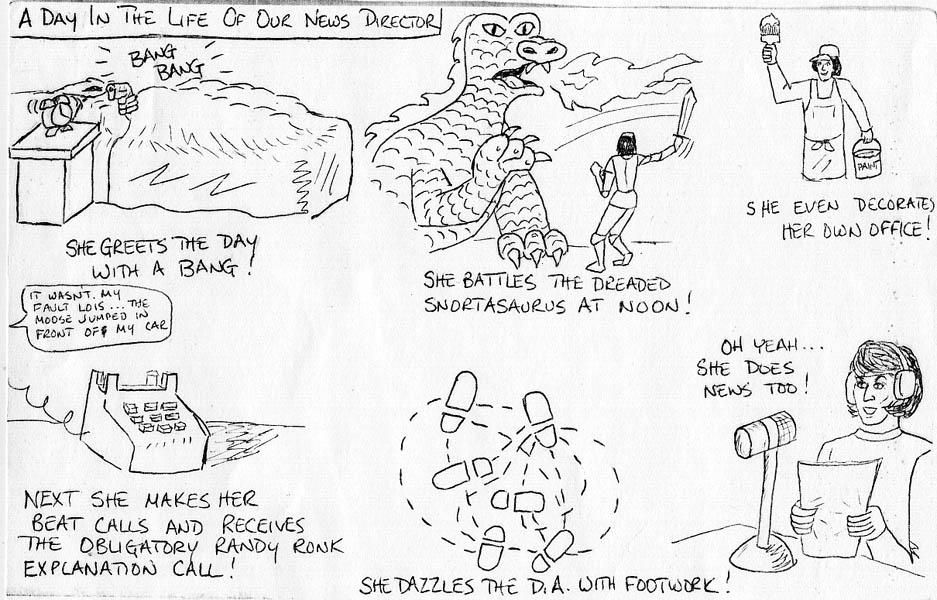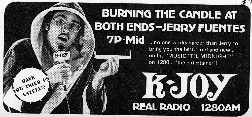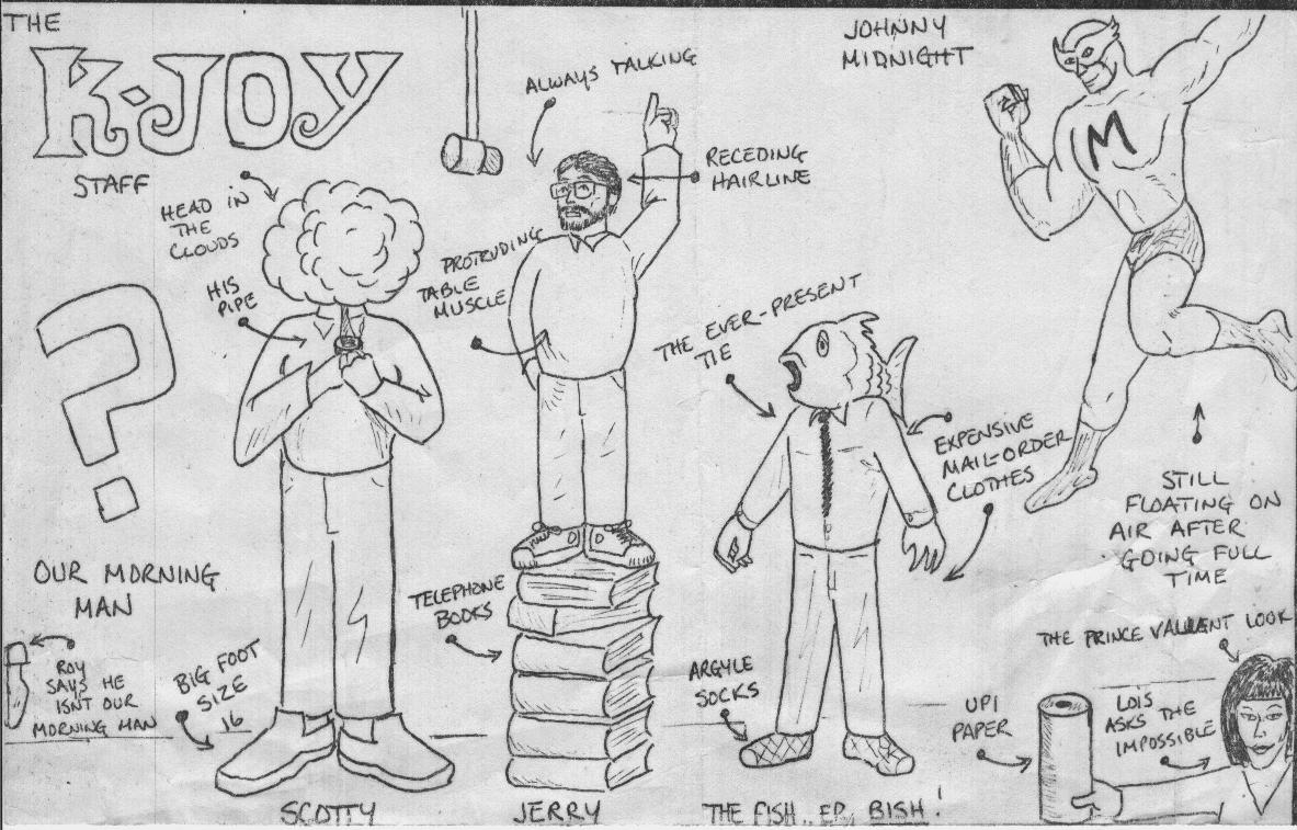 The KJOY Announcing Staff as drawn by Jerry Fuentes Lois Zettas' Day as drawn by Jerry Fuentes Tim Rose - 1980 Jerry Fuentes with Stockton's Chris Isaak - 1985 "Live Aid for Africa" broadcast from Sherwood Mall - 1985