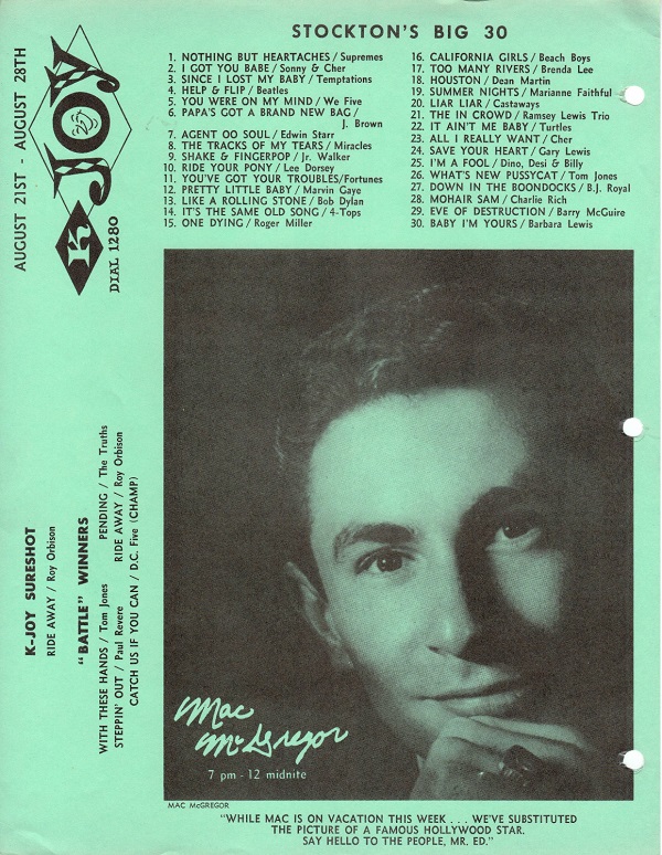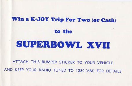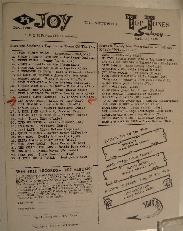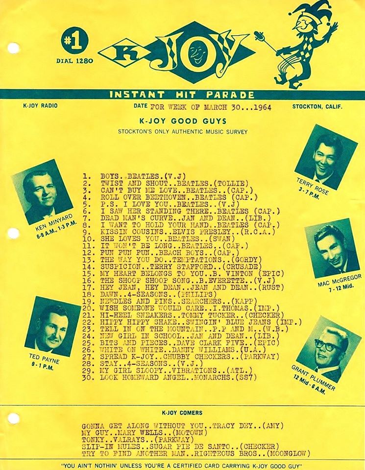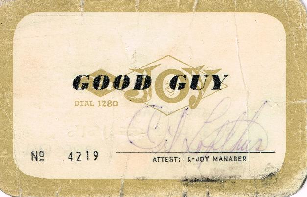 and Weber - 1960 The Studios on the corner of El Dorado and Weber April, 1981 KJOY Transmitter on Beyer Lane 1959 Survey John Cameron remote broadcast (1950's) Dion, Kathy Young, Denny Kerwin, Unknown, 1963 "Top Tunes" "Hit Parade" from 1964 The KJOY "Good Guy" Card "Good Guys" Mug 1965